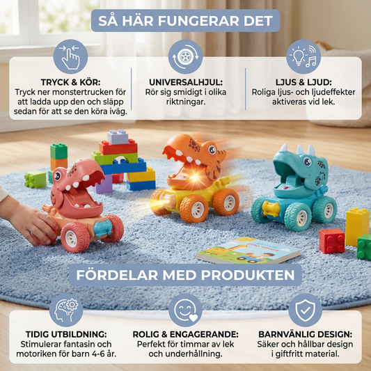 Tryck & kör dino-monstertruckar