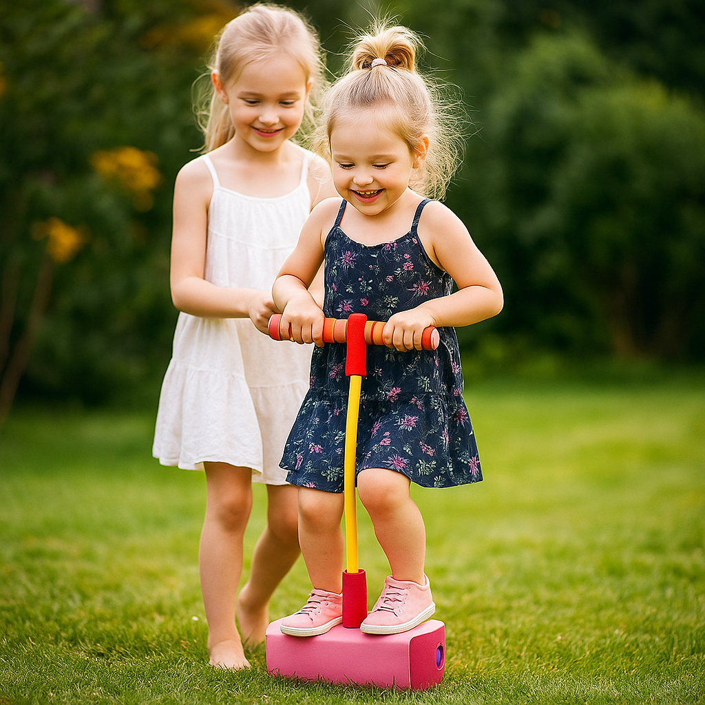 Pogo-hopparen ger barnen glädje genom rörelse, samtidigt som föräldrar kan känna sig trygga med säkerheten. Den halkfria fotbasen och det greppvänliga skumhandtaget ger stabilitet – oavsett om det är på kakel, matta eller gräs.