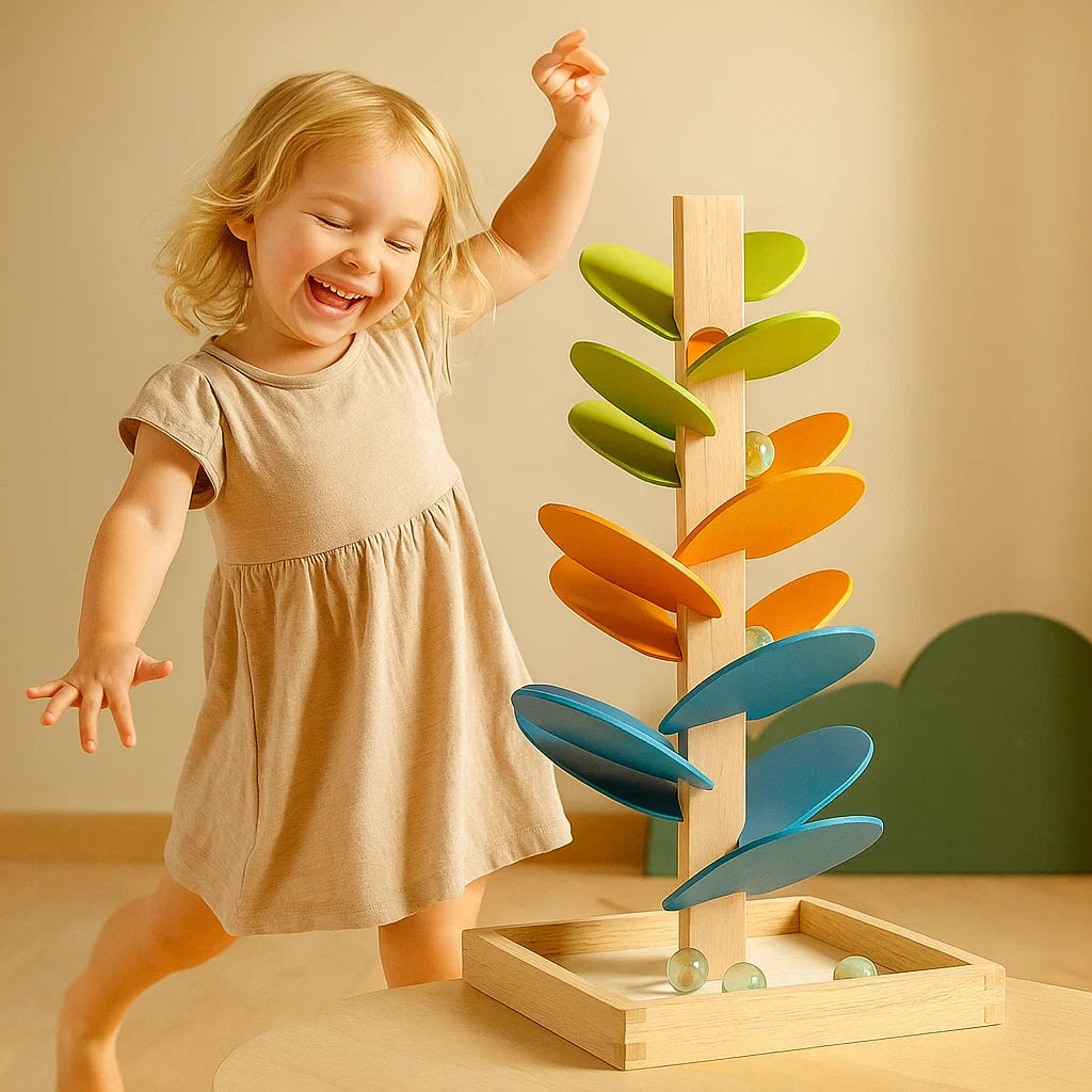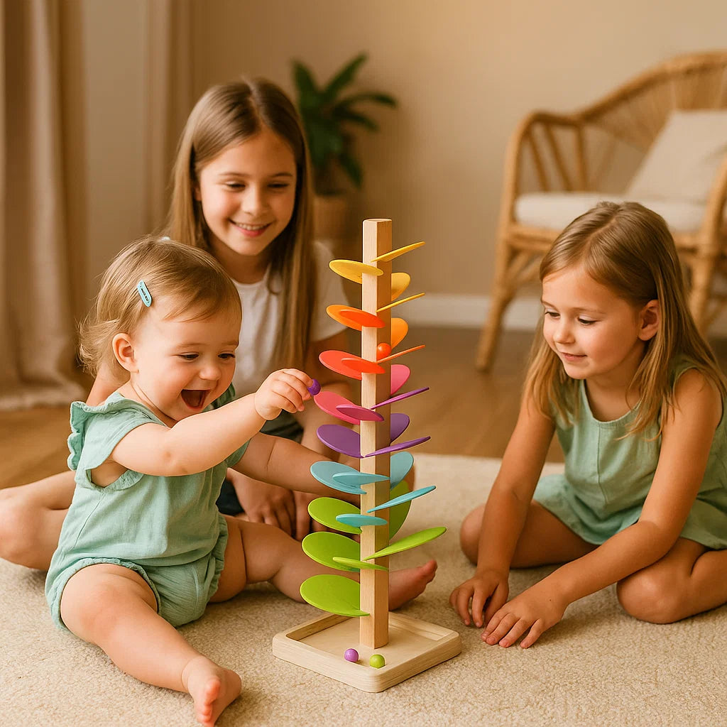 - 🎵 Musikaliska ljud: Bollar avger mjuka, lugnande ljud när de rullar nerför banan, vilket ger en sensorisk dimension till lekstunden.