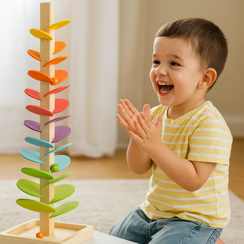 Introducera dina små till en värld av kul, färg och lärande med träkulsträdet! Denna livfulla leksak stimulerar inte bara barnens fantasi utan hjälper dem också att utveckla sina motoriska färdigheter. Se när de placerar de färgglada bollarna i toppen av trädet och njut av hur de rullar nerför de flerfärgade bladen, vilket skapar en rolig och rytmisk musikspårseffekt.