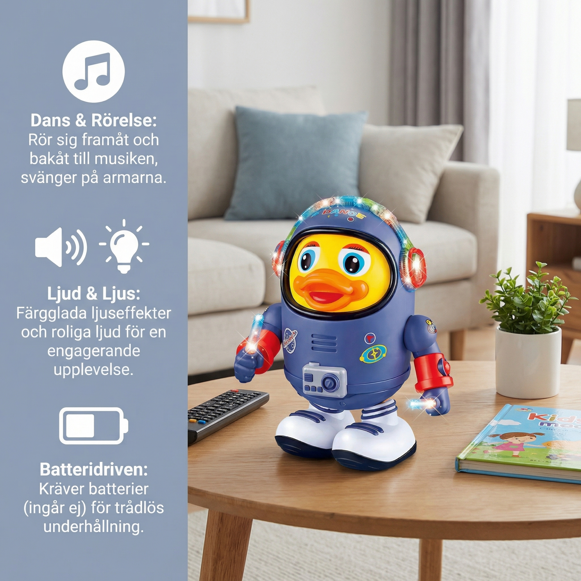 Med sina spännande dansrörelser och glada melodier skapar Den Dansande Astronautankan många lyckliga stunder. Den hjälper till att väcka fantasin och låter barnen kliva in i rollen som små rymdfarare medan de ser ankan utföra sin ”rymd-dans”.