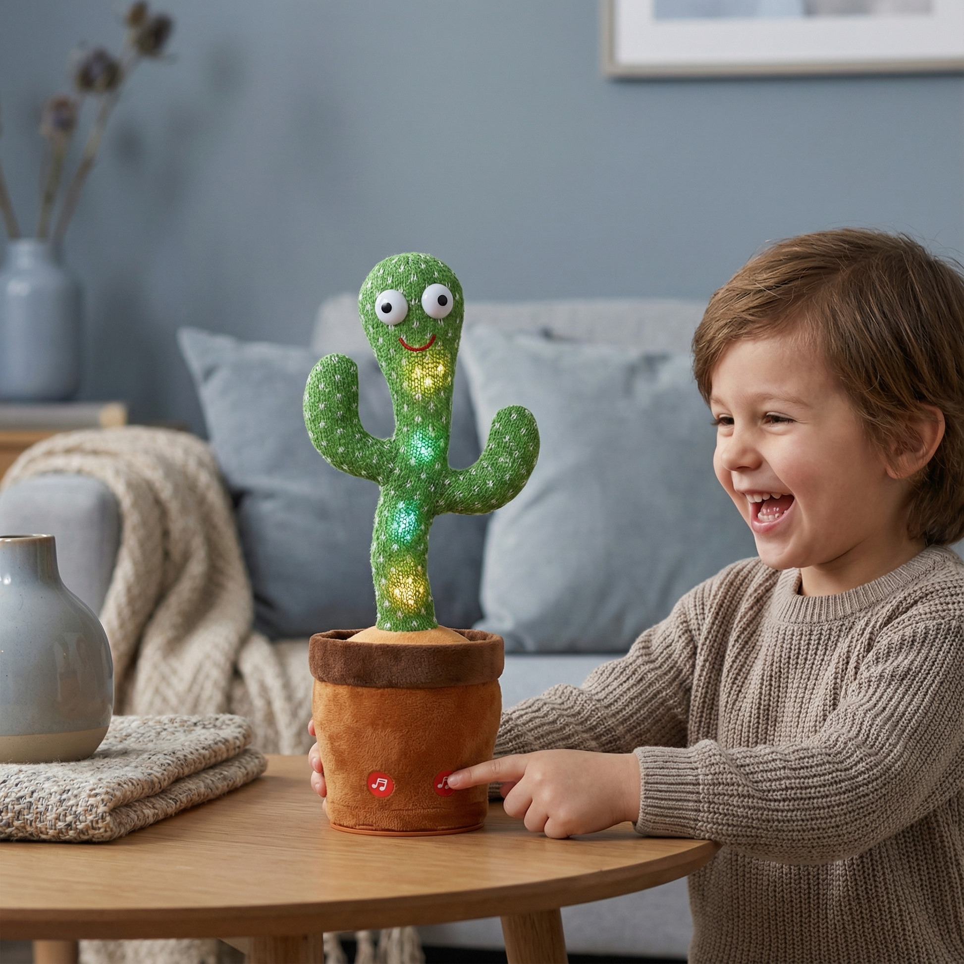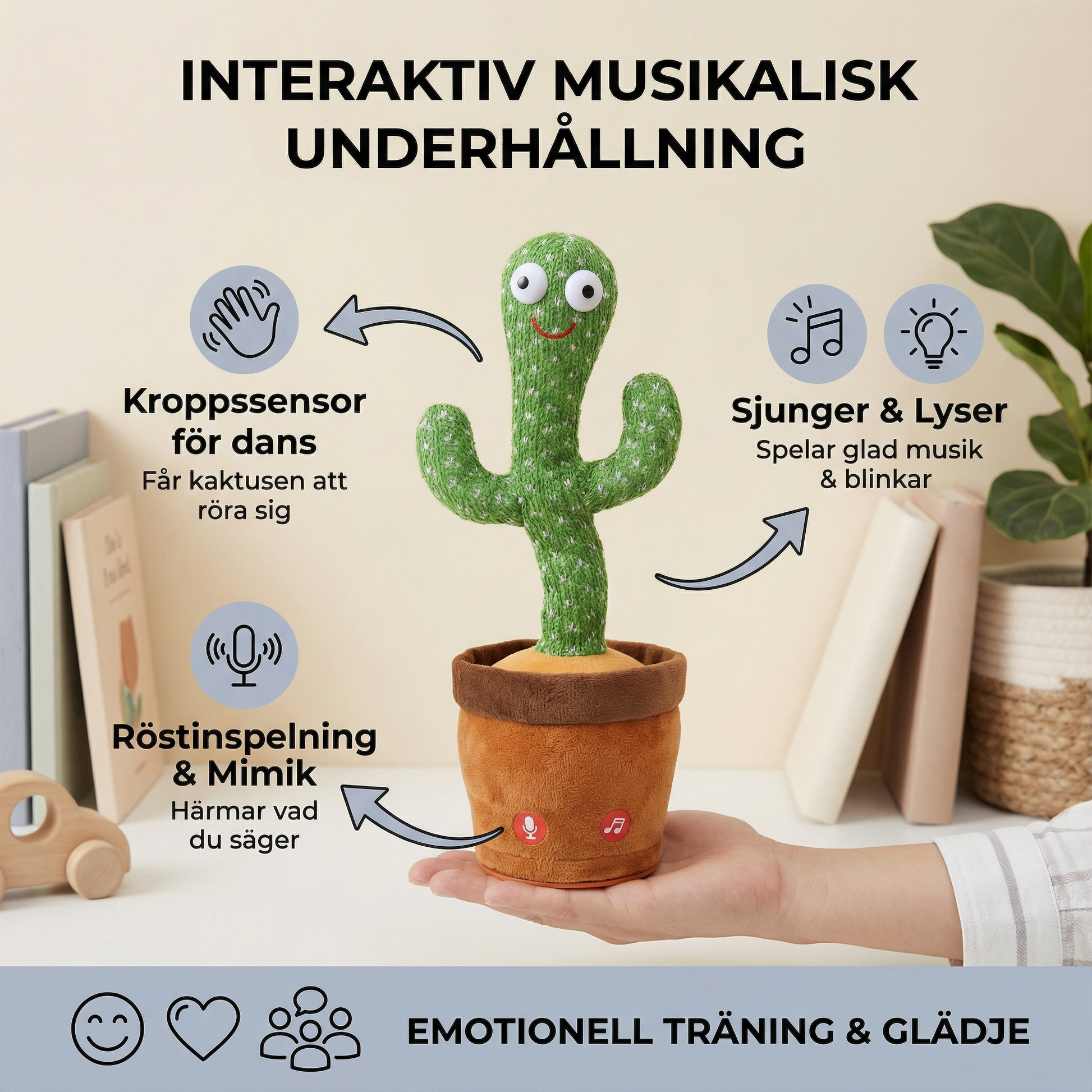 Den här dansande kaktusen handlar inte bara om att ha roligt - den hjälper barn att växa genom rörelse, ljud och interaktion. Oavsett om de kopierar rörelserna eller skrattar åt röstmimiken engagerar barnen sina sinnen och bygger upp sitt självförtroende. Det stöder tidiga inlärningsmilstolpar på ett sätt som känns som ren underhållning.
