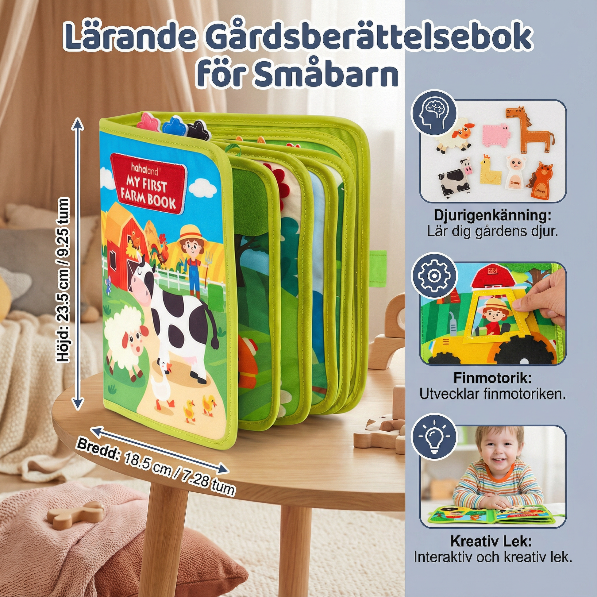 Med sina mjuka, säkra material och hållbara design är den här boken perfekt för både lek hemma och på resan. Ditt barn kan lära sig och utforska utan skärmar eller komplicerade leksaker. Den lätta och bärbara designen gör att den lätt får plats i en väska, vilket gör den till en perfekt följeslagare för bilturer, flygresor eller lugn lektid var som helst. Varje detalj är omsorgsfullt utformad för att ge barn en trevlig och säker inlärningsupplevelse.