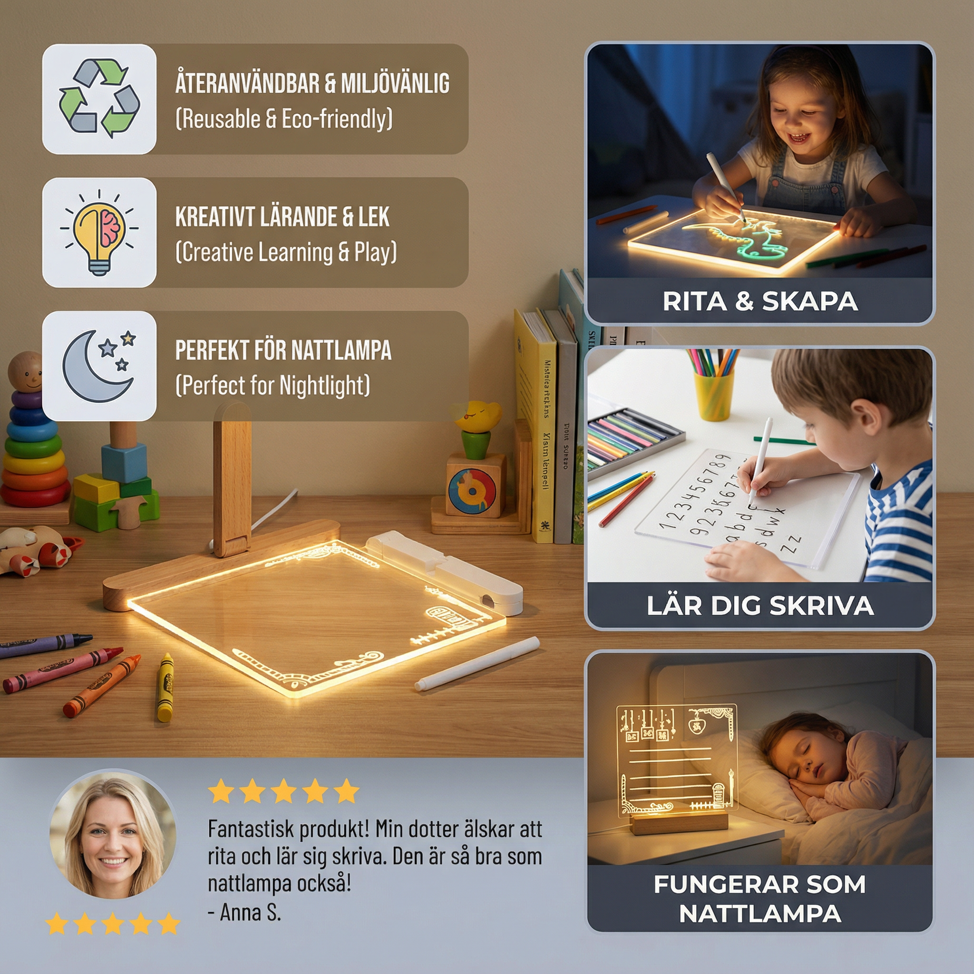 Den här LED-skriv- och ritplattan är ett utmärkt verktyg för att lära sig genom lek. Den hjälper barn att utveckla viktiga färdigheter som att skriva, rita och känna igen färger, samtidigt som de har roligt med den interaktiva lysande ytan.