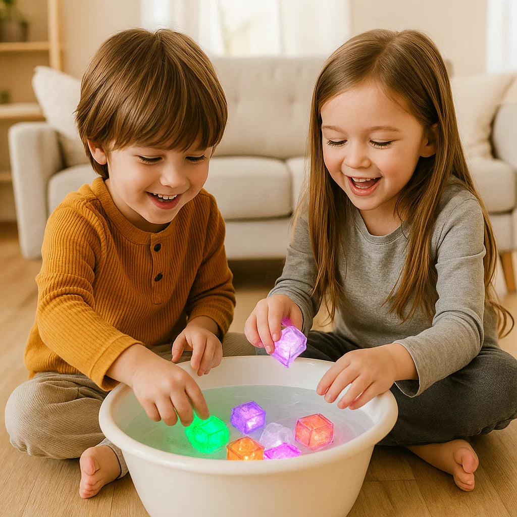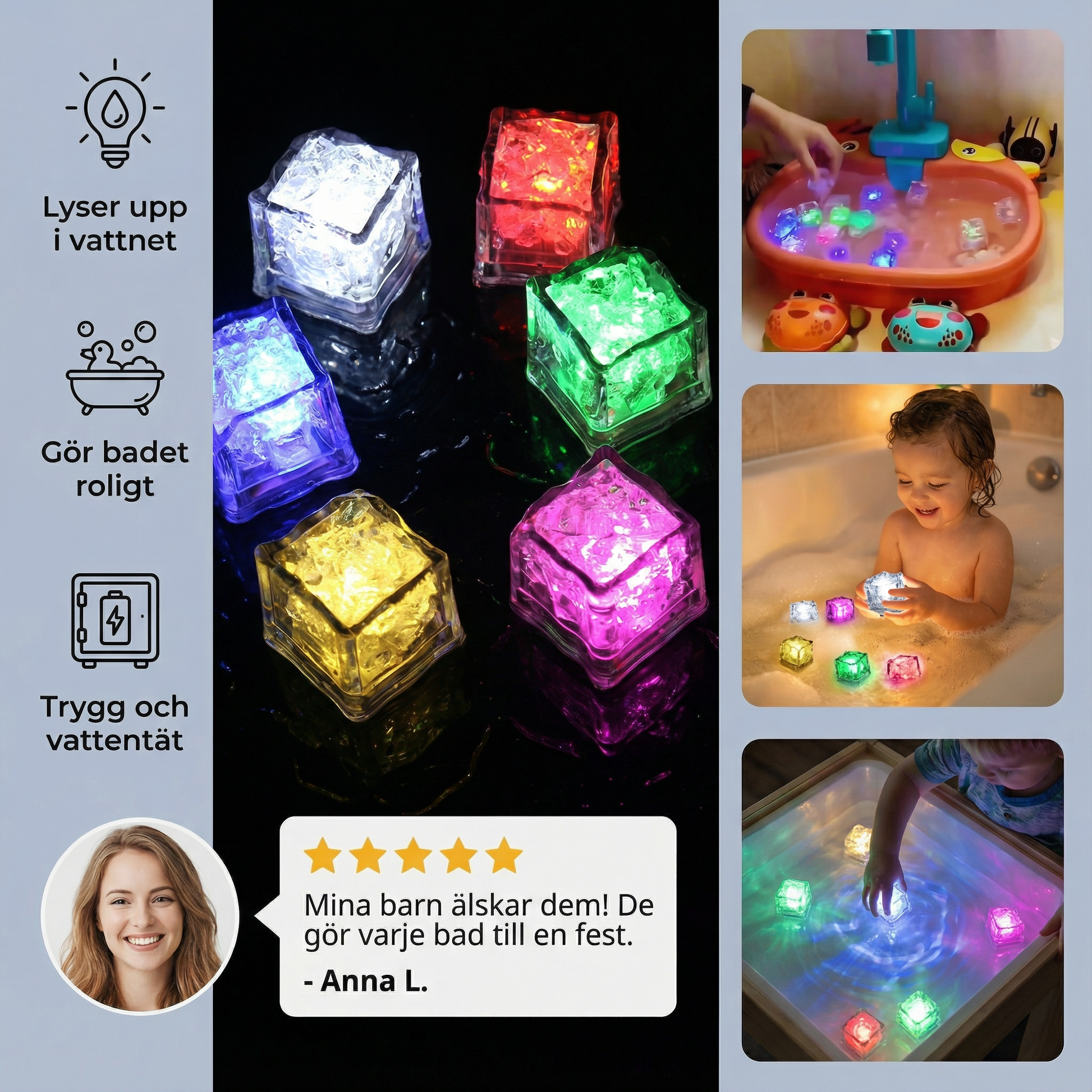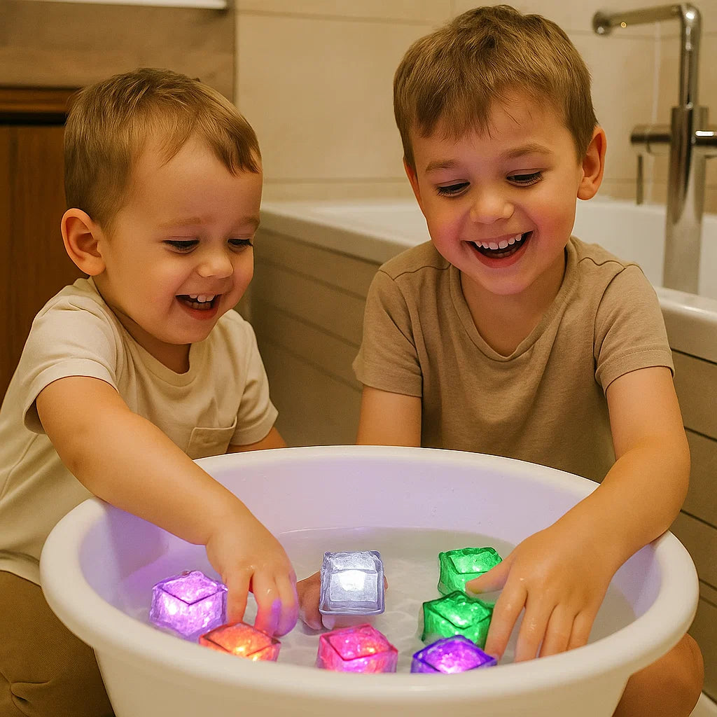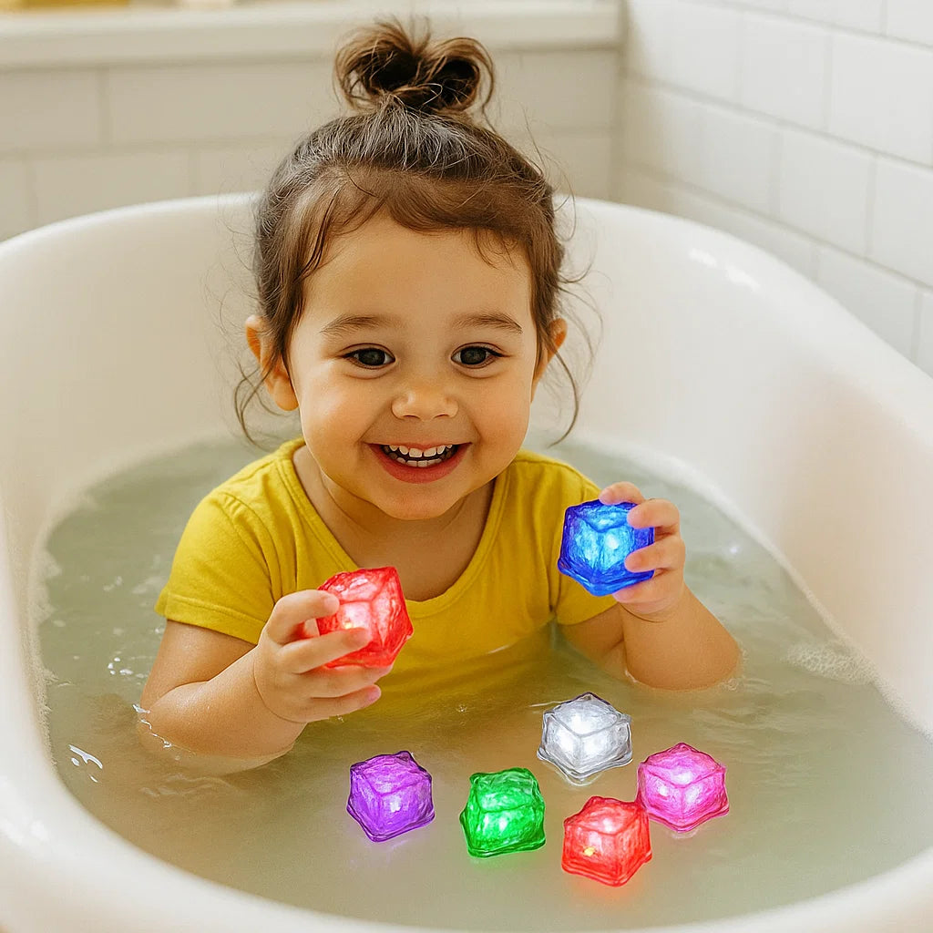 Många barn tycker att bad är tråkigt eller obehagligt. De lysande badkuberna förvandlar denna stund till ren glädje! Det mjuka färgspelet lugnar, fångar och fascinerar – vattnet blir en trygg plats fylld av skratt och nyfikenhet.
