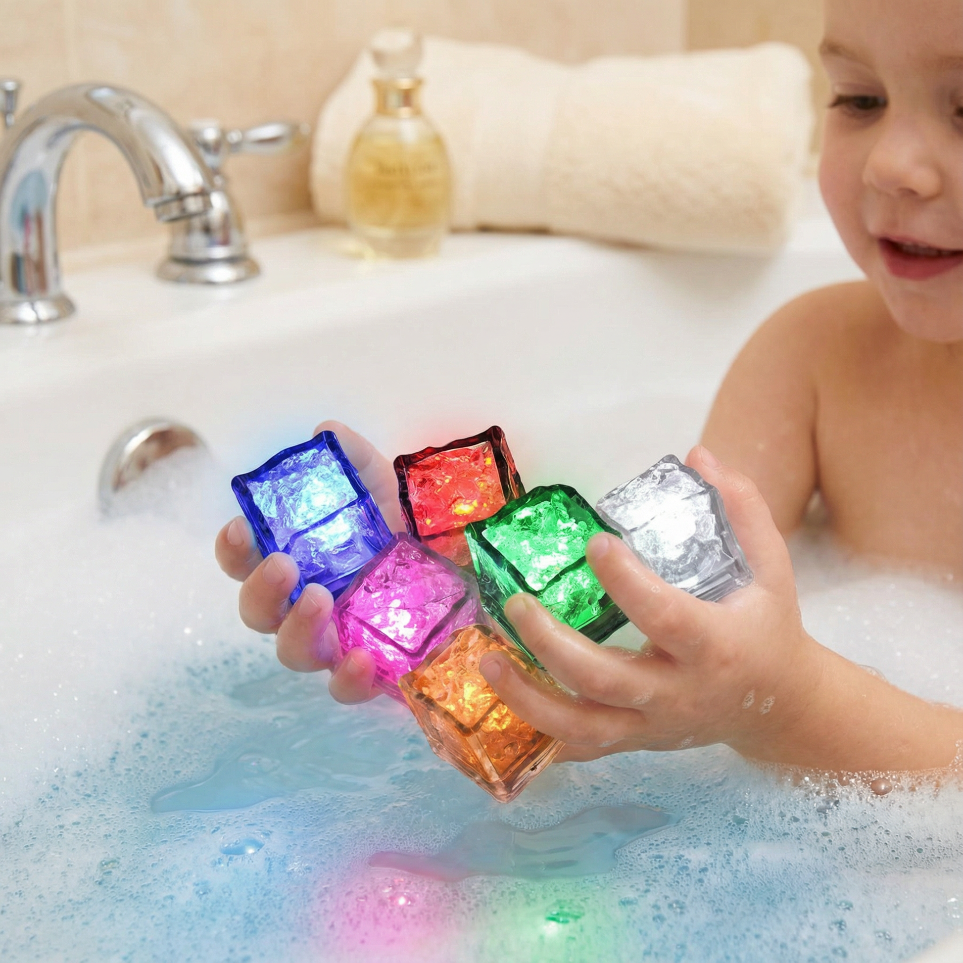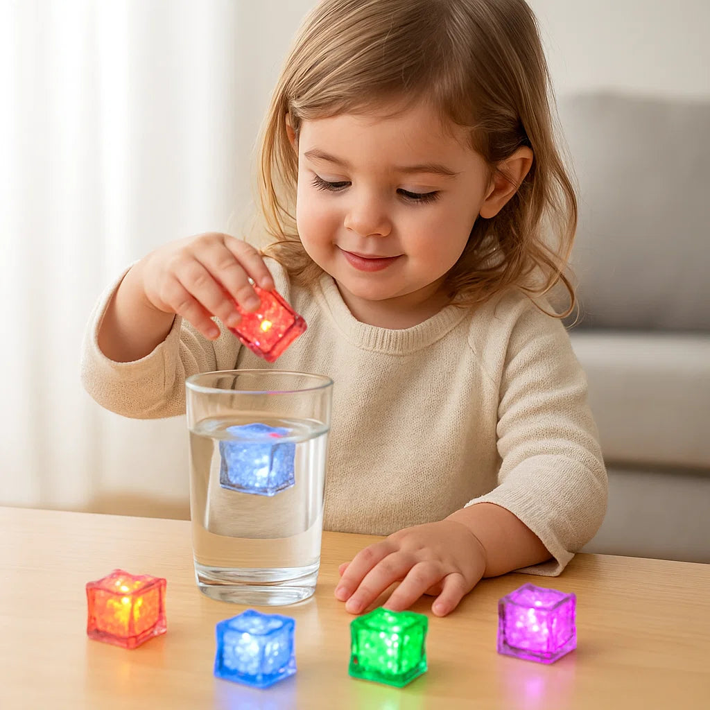Förvandla badrummet till ett färgsprakande hav av ljus! De lysande badkuberna gör varje bad till en fascinerande upplevelse full av färg, lek och förundran. Så snart de kommer i kontakt med vatten börjar de lysa – perfekt för att göra badstunden till ett riktigt äventyr.