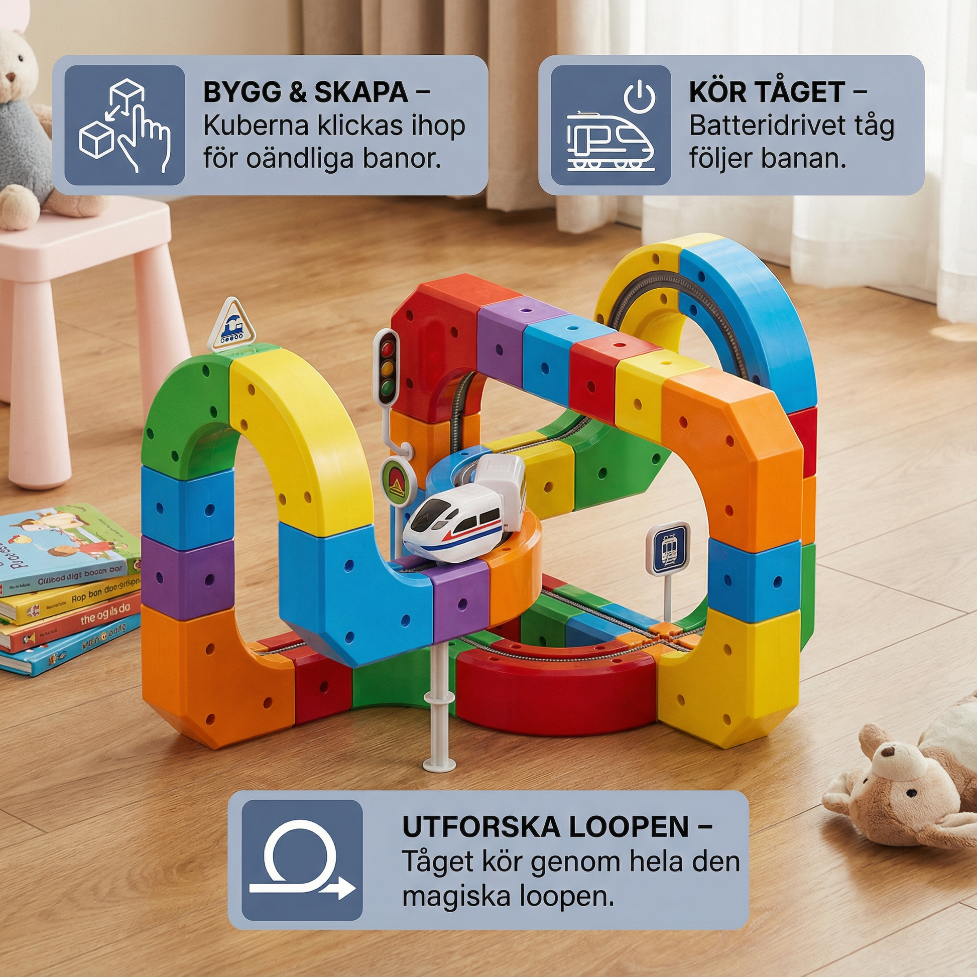 Den magiska kubbanebanan fascinerar både barn och föräldrar. De flexibla byggdelarna gör att nya former och banor alltid kan skapas, vilket främjar motorik, koncentration och fantasi. Den stabila konstruktionen säkerställer långvarig lekglädje utan frustration.