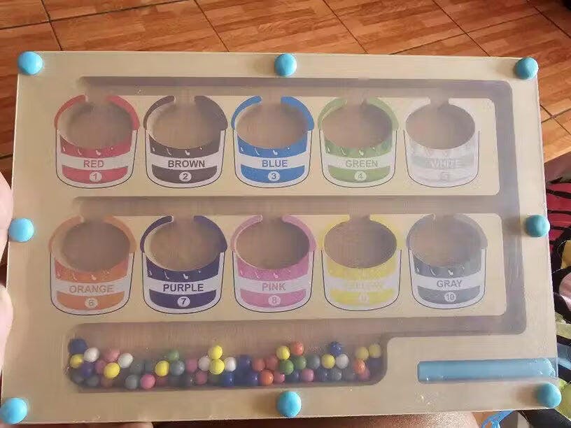 Min dotter älskar att sortera kulorna med pennan. Hon tränar samtidigt både koncentration och finmotorik.