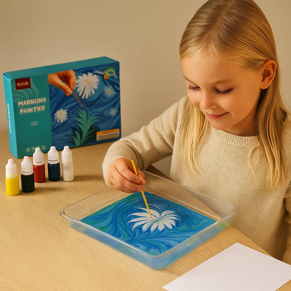 Marmoreringsfärgssatsen gör konsten lekfull och utbildande på samma gång. Barnen lär sig förstå färgblandningar, mönster och kreativ problemlösning samtidigt som de har roligt och utforskar sin egen konstnärliga sida.