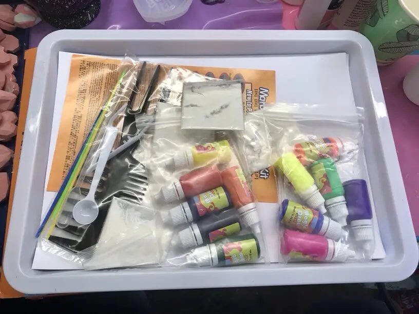 Mina barn blev helt förtjusta i marmoreringsfärgssatsen och kan sitta i timmar. Det är så smidigt att allt man behöver redan ingår.